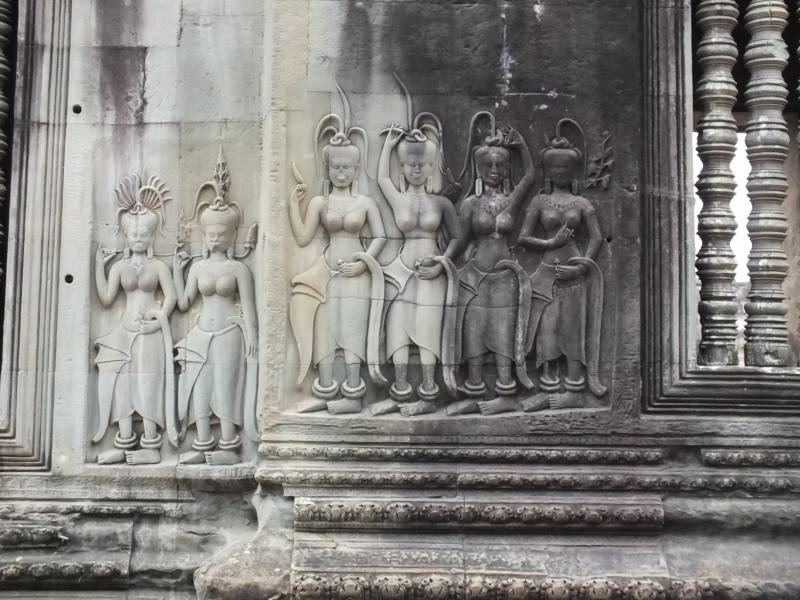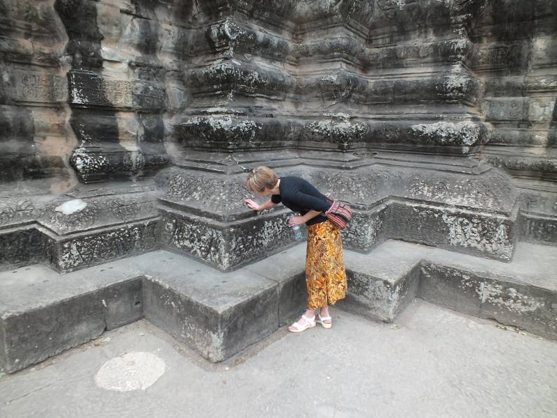 Paredzamais uzturēšanās laiks 4 stundas. Kabatas lukturīšu uz mobilo telefonu gaismu pavadībā ejam pa akmeņainu taku brīnumu gaidīt. Priekšā jau krietns pulciņš uz cietās, rūsganās zemes sasēdušos zinātkāro. Pirmais, kas ienāca prātā: „Kāpēc nepaņēmu kādu šalli, uz kuras varētu mīkstāk apsēsties?” Ar katru minūti palika gaišāks. Priekšā iznira pirmā tempļa aprises, veidojot spoguļattēlu blakus esošajā dīķī. Elpa aizrāvās no tā varenības! Tā veroties apkārt palika gaišs, bet attēlos redzēto saullēktu nesagaidījām. Nebija lemts. Devāmies tempļa virzienā, bet jau tuvojoties sapratu, ka nebiju gatavojusies ieraudzīt tādu varenību un skaistumu. Sākumā pieskāros katram akmenī izcirstajam ornamentam un figūrai. Atliek vien nobrīnīties, kā cilvēki to visu varēja izveidot.