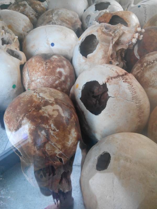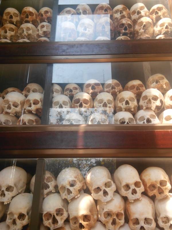 Jau ierodoties Pnompeņā, tika sarunāts tuk-tuk, kurš mūs nogādās nāves laukos un cietumā. Melnais tur jau bija bijis un sīki aprakstījis visu to 3 gadu notikumu gaitu, tāpēc devos viena. Iegādājoties apmeklējuma biļeti, tika piedāvāta opcija „audio gids”, ko es labprāt izmantoju. Savu apmeklējumu sāku no pēdējā pieturas punkta – 17 sekciju memoriāla, kurš ir izveidots no Pol Pota nomocīto cilvēku galvaskausiem un kauliem.