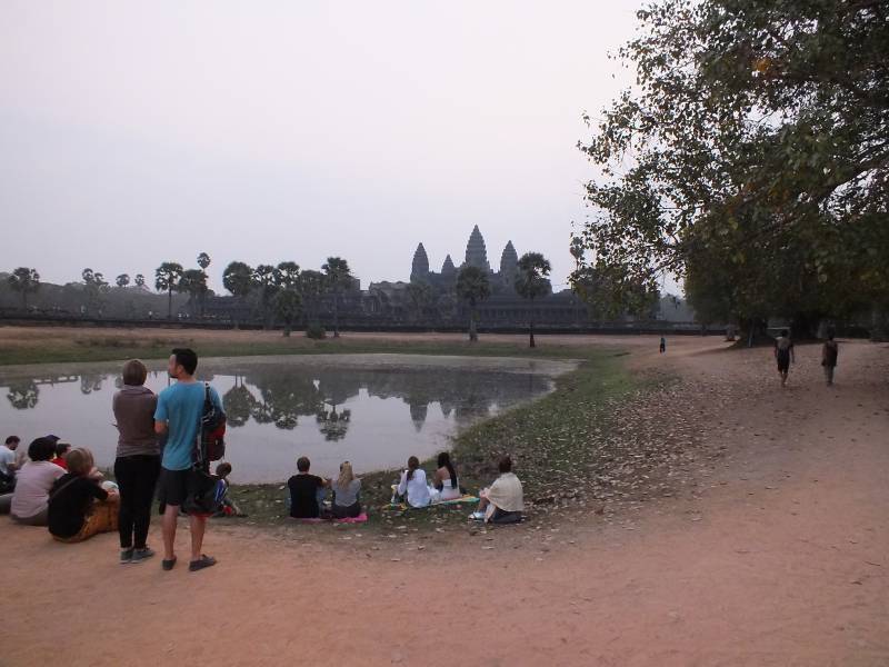 Biļetes nopirktas un varam doties tieši uz Angkoras templi cerībā ieraudzīt saullēktu. Pie tempļa biļešu un sejas kontrole. Tālāk jau ieņemam vietas pretim Angkoras templim un gaidām lielo notikumu.. Šodien nav daudz cilvēku, oktobrī bija krietni vairāk.