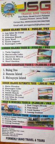 Sakarā ar vēlo ierašanos Coron mums nācās nedaudz saspiest savu apskates programmu. Reāli mums ir tikai 2 pilnas dienas. Nāksies vienā dienā apvienot izbraucienu ar banku pa jūru un Hot spring. Tāpēc mums ir jau šovakar nepieciešams nopirkt izbraucienus ar laivām 2 dienām. Turpat uz Coron centrālās ielas ir daudz ofisu, kuros tiek piedāvātas ekskursijas uz Coron salām. Te būs pilns ekskursiju saraksts ar cenām: