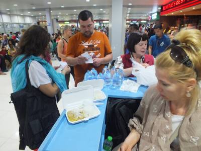 Tā nu visi 9 ceļotāji tiekamies Rīgas lidostā un esam gatavi savam Filipīnu tripam. Pirmās problēmas jau sākās čekojoties iekšā "Aeroflot" lidojumam Rīga - Maskava - Guaņdžou. Meitenīte sāk gvelzt kārtējās muļķības, ka nevarot mūs iečekot, jo lūk mums nav Ķīnas vīzas. Stāstām, ka Guaņdžou ir tikai tranzīta lidosta, tālāk lidojam uz Manilu un mums Guaņdžou pienākas 72 stundu tranzīta koridors. Meičuks domīgi krata galvu un sameklē kaut kādu nodriskātu grāmatu un sāk pētīt vai drīkst mūs čekot iekšā. Par laimi tajā nodriskātajā grāmatiņā atradās mums labvēlīgs ieraksts, bet tikai par 24 stundām. Mums ir vienalga, tas mums der., nesākām pat strīdēties. Bet besī ārā tā totālā nekompetence. Katru dienu meičuks čeko iekšā pasažierus šajā plecā un vēl joprojām nezina par 72 stundu koridoru. Piedevām skatās kaut kādā vecā nodriskātā grāmatā, tā vietā, lai apskatītos aktuālo informāciju internetā, tai pašā "Timatik". Tur informācija ir samērā svaiga un aktuāla. Esam veiksmīgi iečekojušies, un vēl atliek laiks apmeklēt lidostas "Lido". Uzēdam pēdējās nacionālās brokastis ar pēdējo "Užavas" aliņu pirms mēneša prombūtnes. Tālāk būs tikai Filipīniešu nacionālā virtuve.