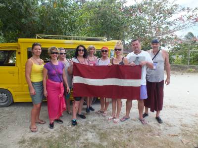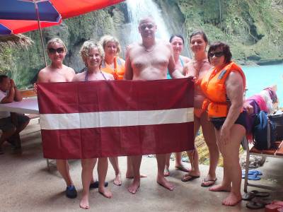 | Te arī bija pienācis brīdis, kad varējām nobildēties uz Latvijas karoga fona. Nelaime tā, ka no mūsu ceļotāja pulka iztrūka 2 cilvēki...... hehehē tā gadās pēc kārtīgas atpūtas dienas. Vēlāk nācās taisīt vēl vienu bildi White beach. Tur bijām jau pilnā komplektā. Skatām ierakstu Nr.5