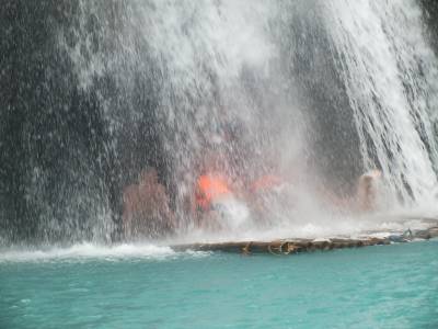 Pēc izpeldēšanās vēsajā ūdenī, kārta ir pienākusi lielajai plostošanai. Sarāpjamies uz plosta un divi stūrmaņi mūs sāk vest tieši zem ūdenskrituma. Kā redzējāt, tās krītošās ūdens masas ir samērā pamatīgas. Sajūtas kolosālas, notiek pilna ķermeņa masāža. Ūdens gāžas ar tādu spēku, ka brīžiem ir grūti elpot. Tas bija ļoti efektīvs brauciens, nu tāds kārtīgs plosts, kādu vēl ceļojuma laikā mēģinājām atkārto uz sauszemes , bet izjūtas protams no tā plosta bija pavisam savādākas. Es nesaku, ka sliktākas..... savādākas..... hehehehē