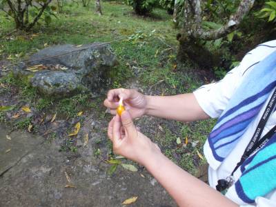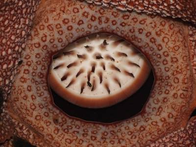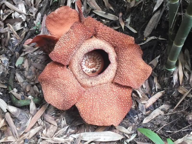 Blakus arī „bērniņš”, ziedēs pēc 6 mēnešiem. Diametrā ap 90 cm, oranži brūna, ar gaišiem punktiem. Smird gan pēc maitām. Trūdot tās izdala nepatīkamu smaku, kas pievilina visādus kukaiņus, mušas un citus knišļus. No viņiem tad arī šī puķe barojas. Noklausāmies veselu lekciju par šo puķi, sabildējam no visiem iespējamiem punktiem un varam doties tālāk.