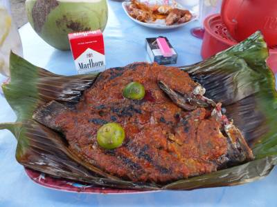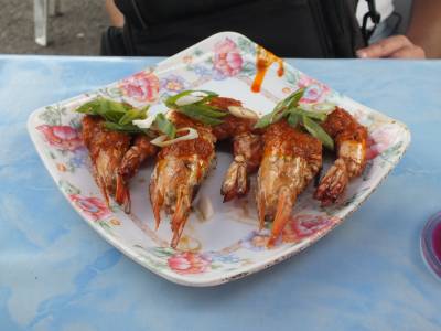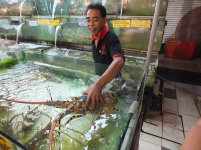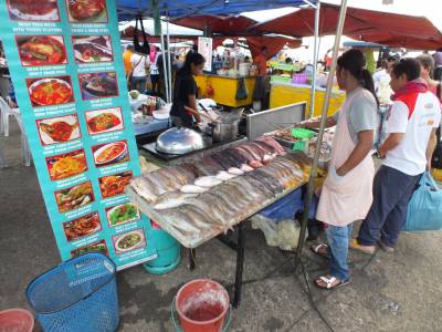 | Tā staigājot ir pienācis vakars un laiks doties uz Filipīniešu nakts tirgu. Tirgū tiek tirgotas tās pašas svaigās zivis, jūras mošķi, augļi un cita pārtika. Tiek tirgots arī „kontrabass”. Vjetnamas cigaretes „Era” maksā 2,50Rm par paciņu, „Marļiks” 10 cigarešu paciņā pa 2Rm. He, hē..... Pats galvenais šīs vietas apmeklējums ir saistīts ar ēšanu. Te atrodas zināmākā un slavenākā nakts ēstuve Kota Kinabalu. Šeit nāk ēst gan vietējie, gan ārzemnieki. Kārtība ir ļoti līdzīga kā Alona bīčā. Katrai jūras veltei ir cena par kilogramu. Izvēlies svaigu zivi, tīģergarneli vai citu jūras mošķi. Tas tiek nosvērts, tiek pateikta cena.