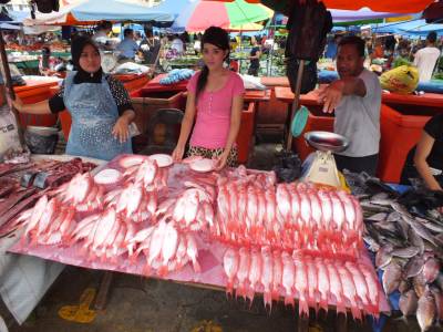 Praktiski visa nepieciešamā informācija ir iegūta un varam sākt apskatīt pašu pilsētu. Apskati sākam ar tirgu netālu no „Warisan square”. Man vislabāk patika tieši zivju tirgus. Tikko nozvejotos lomus pārdod zvejnieki par ļoti labām cenām. Pārdošanā ir dažādas zivis, krabji un citi jūras mošķi.
