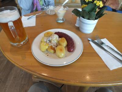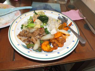 | Nākamais pasākums, pusdienas ķīniešu restorānā. Tas ir labi, jo pēc tām ūdens procedūrām ēstgriba ir lieliska. Tika pasniegti vairāki ēdieni, zupa, rīsi, gaļa, zivis, dārzeņi, mērcītes un desertā augļi. Porcijas milzīgas, viss garšīgi. Ēdām ar lielu apetīti, bet vairāk par pusi nenoēdām.