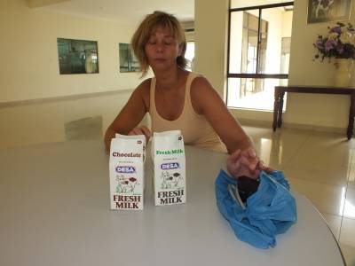 Pie vārtiem jau gaida smagā mašīna, lai gatavo produkciju nogādātu veikalos. Apmeklētāji var visu šo procesu vērot no tuva attāluma. Turpat ledusskapis ar tikko safasēto pienu. Ir iespējams nopirkt un nogaršot. Bijām jau nedaudz sailgojušies pēc svaiga piena. Katrs paņēmām pa puslitriņam. Bija labi, pieniņš svaigs un trekns.