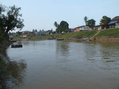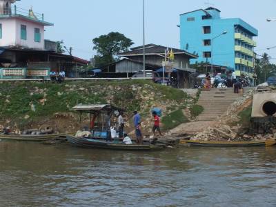 Pagaidām atstājam viņu mierā, jo ceram, ka tālāk būs labāki šie veikali. He, he nekādu citu veikalu tur nav. Kad esam izstaigājuši visu centrālo laukumu, nogriežoties pa mazu, necilu ieliņu nonākam upes krastā. Upīte maziņa. Nu maksimums 30 metru platumā. Kā izrādījās tā arī ir robežupe. Otrā krastā jau ir Taizeme. Pa upīti norisinās dzīva cilvēku un preču kustība. Nekādus robežsargus vai muitniekus neredzam. Ja ir vēlme nelegāli šķērsot valsts robežu, tad to var šeit izdarīt bez problēmām.