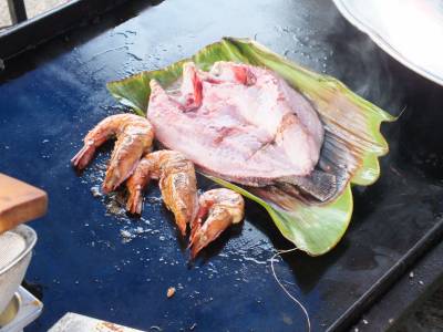Tālāk Tev ir jāizvēlas, kādā veidā to visu pagatavot. Kad esat vienojušies, vari doties pie galdiņiem un gaidīt, kad būs gatavs. Vari arī mierīgi vērot kā tiek gatavots tavs pasūtījums. Jūras produktu izvēle milzīga. Gatavo nu ļoti garšīgi. Es pasūtīju lielu zivi, bet Melnā Princese 3 milzīgas tīģergarneles. Neko nesarežģījot izvēlējāmies grilēto variantu.
