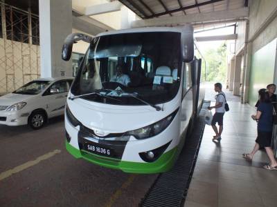 Kota Kinabalu ir divas lidostas. Viena no otras atrodas ievērojamā attālumā, ar kājām neaiziesi. Kārtējās problēmas ar ATM, terminālī ir divi naudas automāti, bet neviens no viņiem nevēlas man izsniegt naudu. Nācās mainīt 100$. Sabiedriskais transports no lidostas tik vēlu vairs nekursē. Sākas saskare ar jau ierasto lidostu takšu mafiju. Līdz mūsu „Tune Hotelim” fiksētā cena ir 50 Rm, līdz pilsētas centram 30Rm. Ņemam taksi līdz pilsētas centram. Zinu, ka no pilsētas centrālā laukuma „Warisan square” kursē bezmaksas shuttle bus uz mūsu viesnīcu. Brauciens ar taksi līdz pilsētas centram aizņem 20 minūtes. Sagaidām savu bezmaksas transportu. Pirms tam mazā kioskā ir jāizņem biļetes. Tur noprecizē no kuras viesnīcas un istabiņas Nr. Viesnīca atrodas tālu no centra, ar autobusu jābrauc 25 minūtes. Viesnīca atrodas pie milzīga šoping centra „1Borneo”.