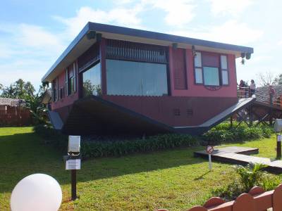 | No rīta padzeram kafiju un 7:00 pie sava hoteļa gaidām vakar nofraktēto auto. Mūsu šoferītis vārdā Jai noprasa no kurienes mēs esam, neliela iepazīšanās un ceļojums var sākties. Mums ļoti noveicās ar viņu, ekskursijas viņš vada apmēram 5 gadus. Ļoti mutīgs, atraktīvs un zinošs gids. Pirmā pietura pie mājas, kura uzbūvēta „ar kājām gaisā”.