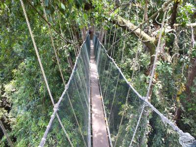 | Nākamā pietura pats dabas parks, kur ir paredzēta pastaiga pa dabas taku, trošu celiņš un karstie termālie ūdeņi. Dabas skati brīnišķīgi. Gājiens pa džungļu taku ir samērā viegls, taciņa labi uzturēta. Vienīgi, mūsu gids nemitīgi lūkojas pa malām. Uz jautājumu kas par lietu, atbilde ir sekojoša: „Šajā dabas parkā mitinās liels daudzums indīgu čūsku, ko ar netrenētu aci ir grūti pamanīt!” Nu nezinu, nevienu no viņām tā arī nesastapām. Nonākam pie trošu ceļa. Samērā iespaidīgi. Troses novilktas praktiski līdz koku galotnēm. Pārvietoties var par dēlīti, kam gar malām novilkts tīkls, lai kādu ceļotāju pa ceļam nepazaudē. Viss šūpojas un līgojas. Laipas garas. Pavisam tādas laipas ir 7. Starp laipām skatu laukumi.