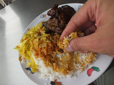 Tad nu bija laiks ķerties pie ēšanas. Bāzu savus pirkstus rīsos un krāmēju tik mutē.