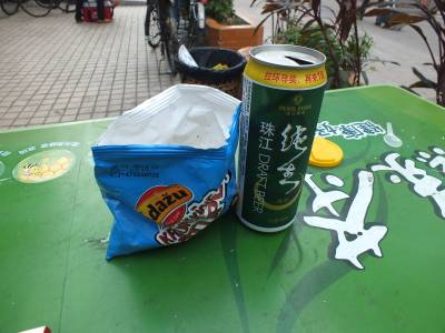 Turpat arī daudzi kioski un pārdošanas vietas kur var iegādāties ko ēdamu, vietējo alu un cigaretes. Nopērku ķīniešu aliņu un apsēžos pie galdiņa. Lēnām to dzeru un piekožu klāt Ādažu kartupeļu salmiņus. Laba kombinācija.
