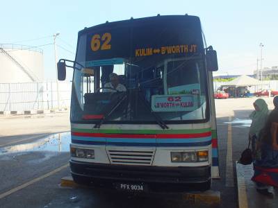 Man nav skaidrs par to brauciena maksu. Virzienā no Džordžtaunas uz Butterworth nekas nav jāmaksā. Otrā virzienā jāmaksā 1,50Rm. Ļoti interesanta sistēma. Nokāpjot no prāmja un paejot 100 metrus, ir autoosta. Noskaidroju, ka uz Kulim kursē autobuss Nr 62, atiet no 6 platformas. Biļetes cena 3,30Rm. Ideāli.