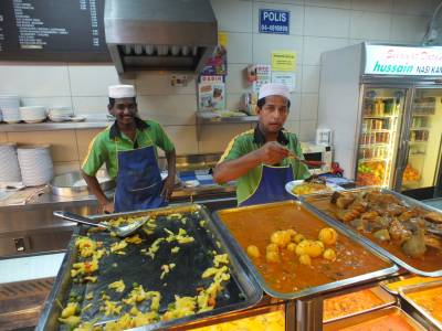 | Lielais eksperiments Netālu no hoteļa ir musulmaņu ēstuve. Saucas "Hussain". Ļoti labi apmeklēta ēstuve. Apgrozījums ļoti labs. Kā novēroju nospiedošā daļa apmeklētāju šeit ēd ar rokām. Ja vēlies ir arī karote un dakšiņa. Tad nu lūk, nolēmu izbaudīt kā ir ēst vakariņas ar rokām. Pilnīgi bez dakšiņas un karotes.