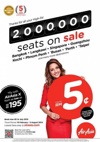 | BIG SALE nākošā gada sākumam. Booking starts 2 Apr 2013 (00:00 GMT+8) - 7 Apr 2013 Travel from 1 Jan - 30 Apr 2014 Fly from Kuala Lumpur Alor Setar Johor Bahru P.Pinang Jakarta Medan Bandung Yogyakarta Phnom Penh Yangon Singapore Hat Yai Krabi ALL-IN FARE FROM USD 10 Langkawi Kota Kinabalu Kuching Miri Sandakan Tawau Phuket Vientiane Ho Chi Minh City ALL-IN FARE FROM USD 18 Siem Reap Guangzhou Guilin Bali Solo Tiruchirappalli Chennai Bangkok Chiang Mai ALL-IN FARE FROM USD 35