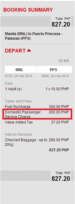 Bacolod (BCD) Domestic 200.00 Bacolod (BCD) International 700.00 Basco (BSO) 100.00 Busuanga (USU) 100.00 Butuan (BXU) 150.00 Cagayan de Oro (CGY) 200.00 Calbayog (CYP) 50.00 Camiguin (CGM) 50.00 Catarman (CRM) 100.00 Caticlan (MPH) 200.00 Cauayan (CYZ) 100.00 Cebu (CEB) Domestic* 220.00 (iekļauta pērkot lidmašīnas biļeti) Cebu (CEB) International 750.00 Clark (CRK) Domestic 150.00 Clark (CRK) International 600.00 Cotabato (CBO) 150.00 Davao (DVO) Domestic 200.00 Davao (DVO) International 700.00 Dipolog (DPL) 150.00 Dumaguete (DGT) 150.00 General Santos (GES) Domestic 150.00 General Santos (GES) International 700.00 Iloilo (ILO) Domestic 200.00 Iloilo (ILO) International 700.00 Jolo (JOL) 100.00 Kalibo (KLO) Domestic 200.00 Kalibo (KLO) International 700.00 Laoag (LAO) Domestic 200.00 Laoag (LAO) International 700.00 Legazpi (LGP) 150.00 Manila (MNL) Domestic* 200.00 (iekļauta pērkot lidmašīnas biļeti) Manila (MNL) International* 550.00 (iekļauta pērkot lidmašīnas biļeti) Masbate (MBT) 100.00 Naga (WNP) 100.00 Ozamis (OZC) 100.00 Pagadian (PAG) 150.00 Puerto Princesa (PPS) Domestic 200.00 Puerto Princesa (PPS) International 700.00 Roxas (RXS) 150.00 San Jose (SJI) 150.00 Siargao (IAO) 150.00 Surigao (SUG) 100.00 Tablas (TBH) 100.00 Tacloban (TAC) 150.00 Tagbilaran (TAG) 100.00 Tandag (TDG) 100.00 Tawi-Tawi (SGS) 50.00 Tuguegarao (TUG) 150.00 Virac (VRC) 100.00 Zamboanga (ZAM) Domestic 150.00 Zamboanga (ZAM) International 700.00